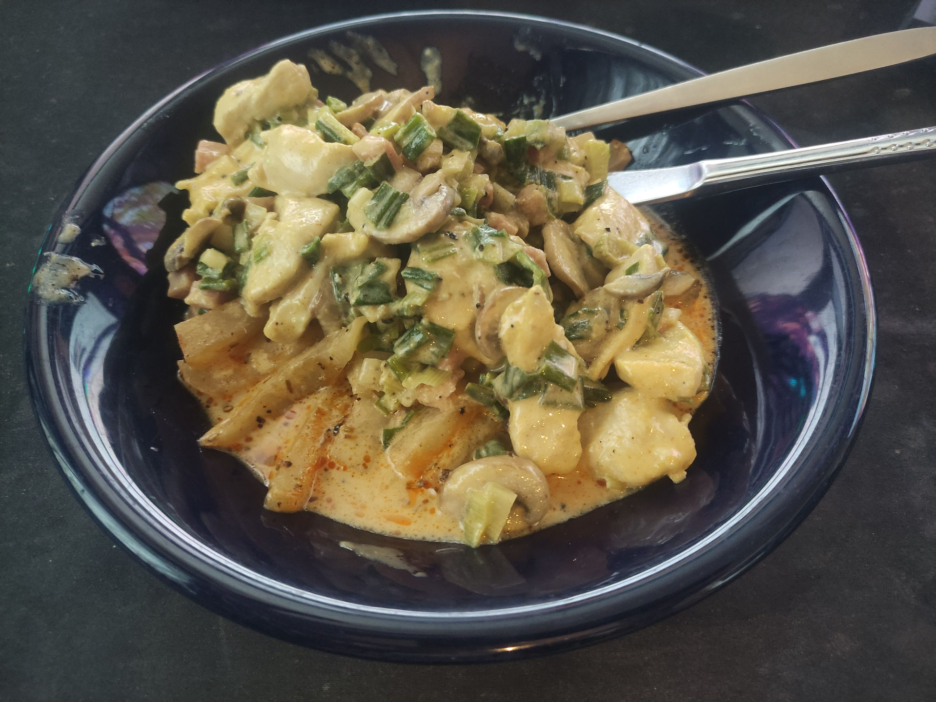 Hähnchen-Kohlrabifries in Käsesoße